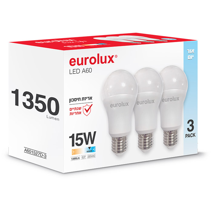 מארז 3 יח' נורות לד 1350 לומן 6000K A60 15W E27 אור יום