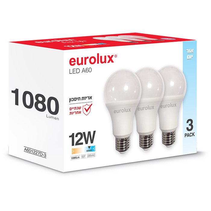 מארז 3 יח' נורות לד 1050 לומן 6000K A60 12W E27 אור יום