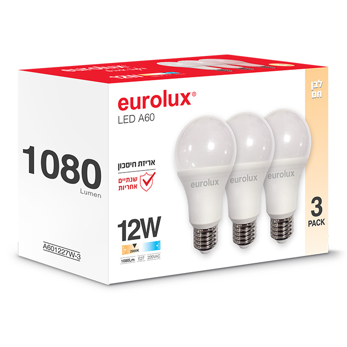 מארז 3 יח' נורות לד 1050 לומן 2900K A60 12W E27 לבן חם