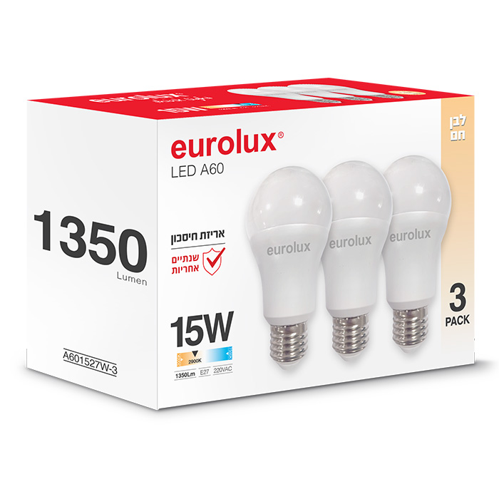 מארז 3 יח' נורות לד 1350 לומן 2900K A60 15W E27 לבן חם