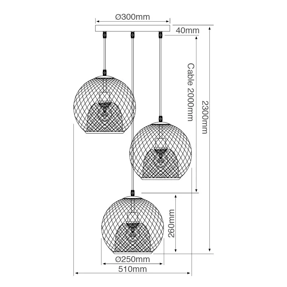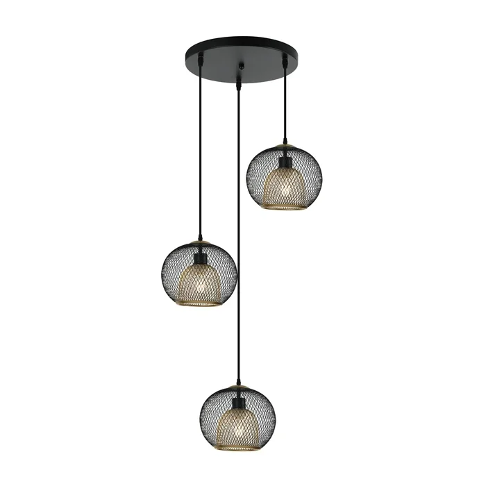 גוף תלייה עגול, שלישייה E27 כדור רשת מתכת-שחור E27 מסדרת "LUSTER" כבל 2 מטר